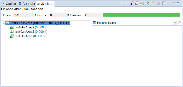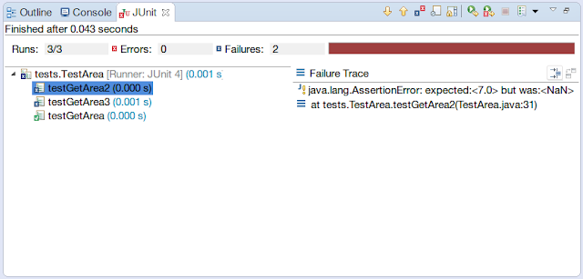 If we run the tests, we will see 1 pass, 2 fails. The reason behind this is in the testGetArea2 and testGetArea3 tests we expected the areas to be nonzero but actually these sides cannot form a triangle! and the areas are NaN (Not a Number).